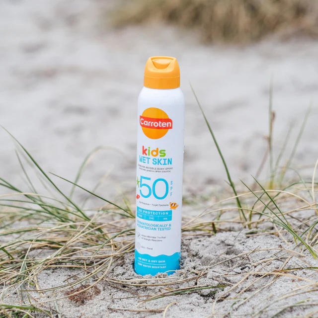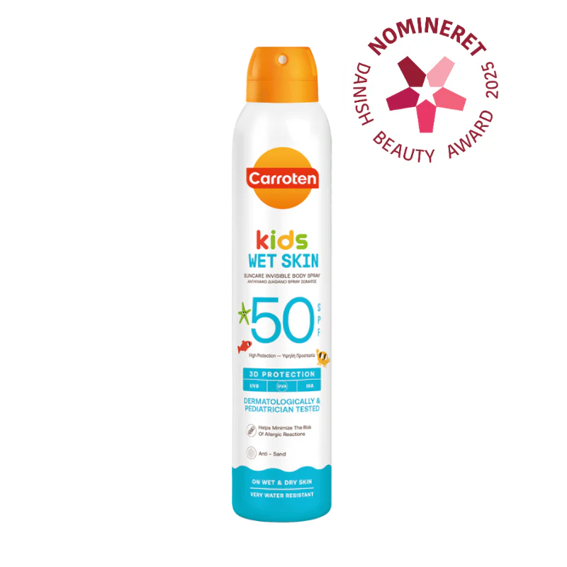 Carroten Kids Wet Spray SPF 50 er en innovation af solbeskyttelse til børn. Carroten fokuserer på børns taktile behov og ikke mindst tålmodighed, når Carrotens SPF på spray nemt påføres våd eller tør hud uden at klistre eller fedte.